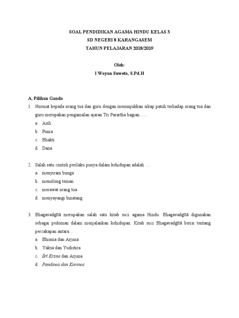 Contoh soal ujian usbn pendidikan agama islam pai sd kelas 6 terbaru sesuai dengan kisi kisi tahun ajaran 20172018. Buku siswa agama hindu sd kelas 1 2 3 4 5 6 kurikulum 2013 terbaru. Cek 40 soal latihan soal agama hindu kls 11 beserta kunci jawaban. Wihara, klenteng, masjid dan pura b. Berikut ini adalah file tentang bank soal uts agama hindu sd kelas 1 6 semester 1 k13 yang bisa bapakibu unduh secara gratis dengan menekan tombol download pada.